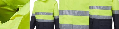 100% Polyester 300 D with PU coating,Taffeta lining,Long-line styling,Concealed hood inside collar,Wind flaps with Velcro closure,Plastic patch pocket,Fully sealed seams,Zips onto 6D4RV Hi Vis (D+N) Reversible Vest